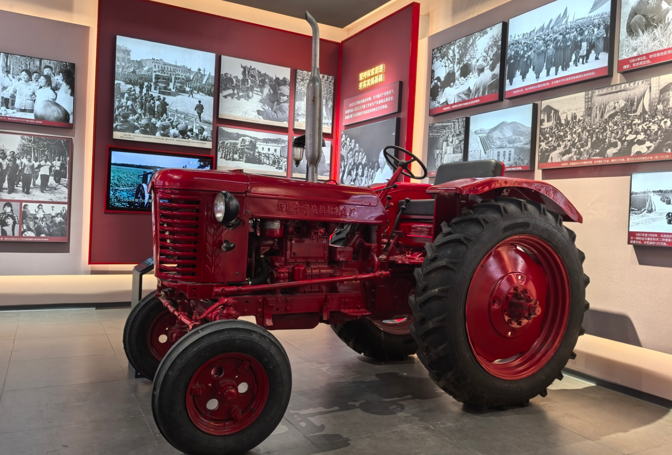 在新疆維吾爾自治區(qū)成立70周年主題成就展上,一臺名為“躍進(jìn)”的紅色24馬力輪式拖拉機(jī)吸引了不少參觀者的目光。大家紛紛與之合影留念,了解這個(gè)“鐵疙瘩”背后的光陰故事。