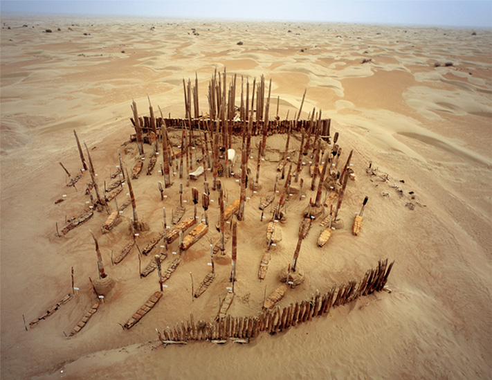 小河墓地位于巴音郭楞蒙古自治州若羌縣孔雀河下游河谷南約60公里的荒漠中,東距樓蘭古城遺址175公里,西南距阿拉干鎮(zhèn)36公里,是距今約3400年至4000年的青銅時代文化遺存,屬于夏商時期塔里木盆地特色鮮明的文化遺存。