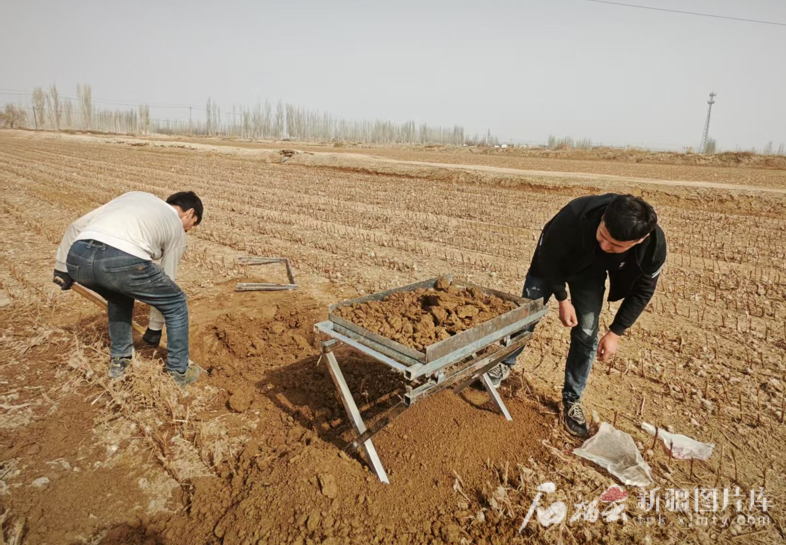 3月18日,在庫車市二八臺(tái)鎮(zhèn)拉依蘇村棉田地膜殘留監(jiān)測(cè)點(diǎn)位,工作人員正在挖取土樣。 王紅麗攝