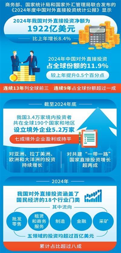 中國(guó)對(duì)外投資總體情況如何?商務(wù)部、國(guó)家統(tǒng)計(jì)局和國(guó)家外匯管理局不久前聯(lián)合發(fā)布的《2024年度中國(guó)對(duì)外直接投資統(tǒng)計(jì)公報(bào)》顯示,中國(guó)已連續(xù)13年位列全球?qū)ν庵苯油顿Y流量前三,對(duì)外投資大國(guó)地位日益穩(wěn)固。