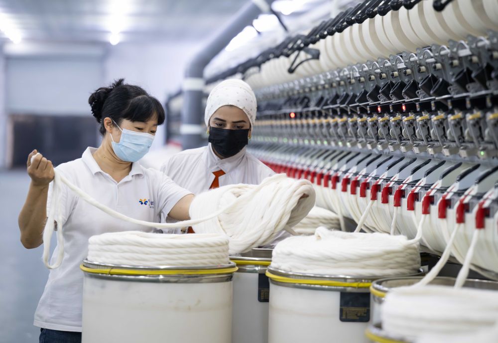 在塔吉克斯坦哈特隆州丹加拉區(qū)的中塔合作項(xiàng)目丹加拉農(nóng)業(yè)紡織產(chǎn)業(yè)園,紡紗車間主任孫月輝(左)指導(dǎo)塔方員工依迪古。