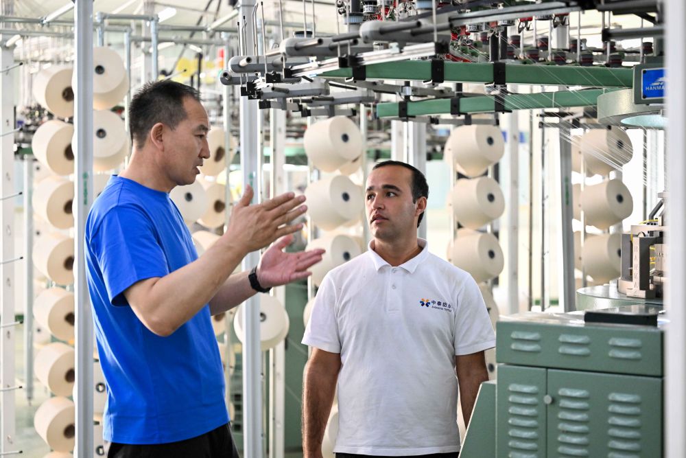 在中塔合作項(xiàng)目丹加拉農(nóng)業(yè)紡織產(chǎn)業(yè)園的針織車間,中方員工指導(dǎo)塔方員工古夫龍(右)工作。