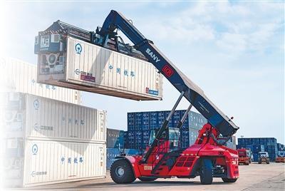 在中老鐵路萬(wàn)象南貨運(yùn)口岸站,起重機(jī)吊起即將發(fā)往中國(guó)的冷鏈集裝箱。人民日?qǐng)?bào)亞太中心分社 蘇朋攝