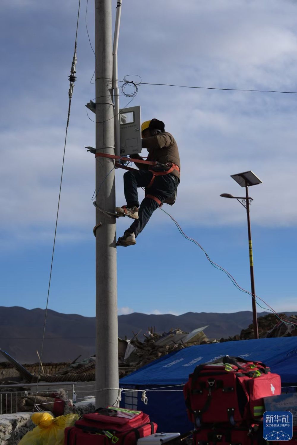1月7日,在定日縣長(zhǎng)所鄉(xiāng)古榮村,工作人員在搶修供電線路。新華社記者 晉美多吉 攝