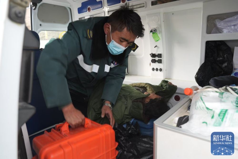 1月7日,在定日縣長(zhǎng)所鄉(xiāng)古榮村,工作人員在救護(hù)車(chē)?yán)锕ぷ?。新華社記者 晉美多吉 攝