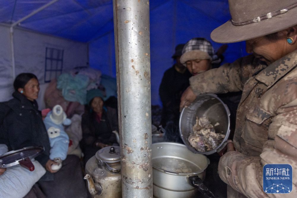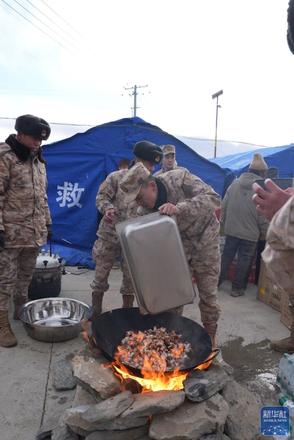 1月7日,在定日縣長(zhǎng)所鄉(xiāng)古榮村,救援人員在準(zhǔn)備晚飯。新華社記者 晉美多吉 攝