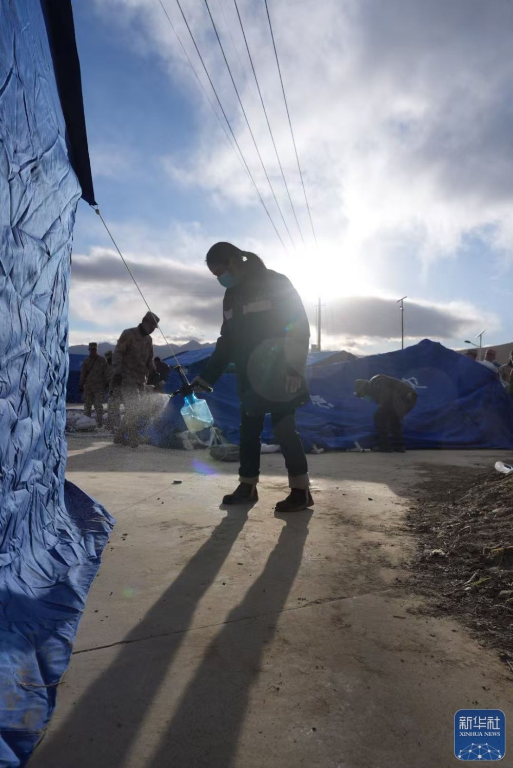 1月7日,在定日縣長(zhǎng)所鄉(xiāng)古榮村,工作人員進(jìn)行消殺作業(yè)。新華社記者 晉美多吉 攝