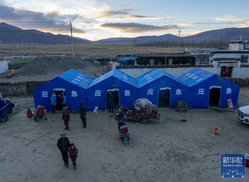 1月7日,在拉孜縣曲下鎮(zhèn)土林村,受災(zāi)群眾搬入應(yīng)急帳篷(無(wú)人機(jī)照片)。新華社記者 姜帆 攝