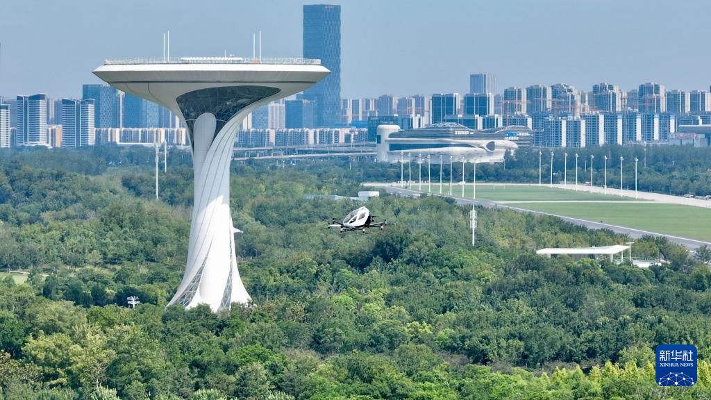 7月2日,一架電動垂直起降飛行器(eVTOL)在合肥駱崗公園演示飛行(無人機(jī)照片)。新華社記者 周牧 攝