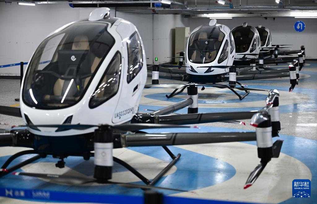 7月2日,在合肥駱崗公園,幾架電動垂直起降飛行器(eVTOL)停放在充電機(jī)庫中。新華社記者 周牧 攝