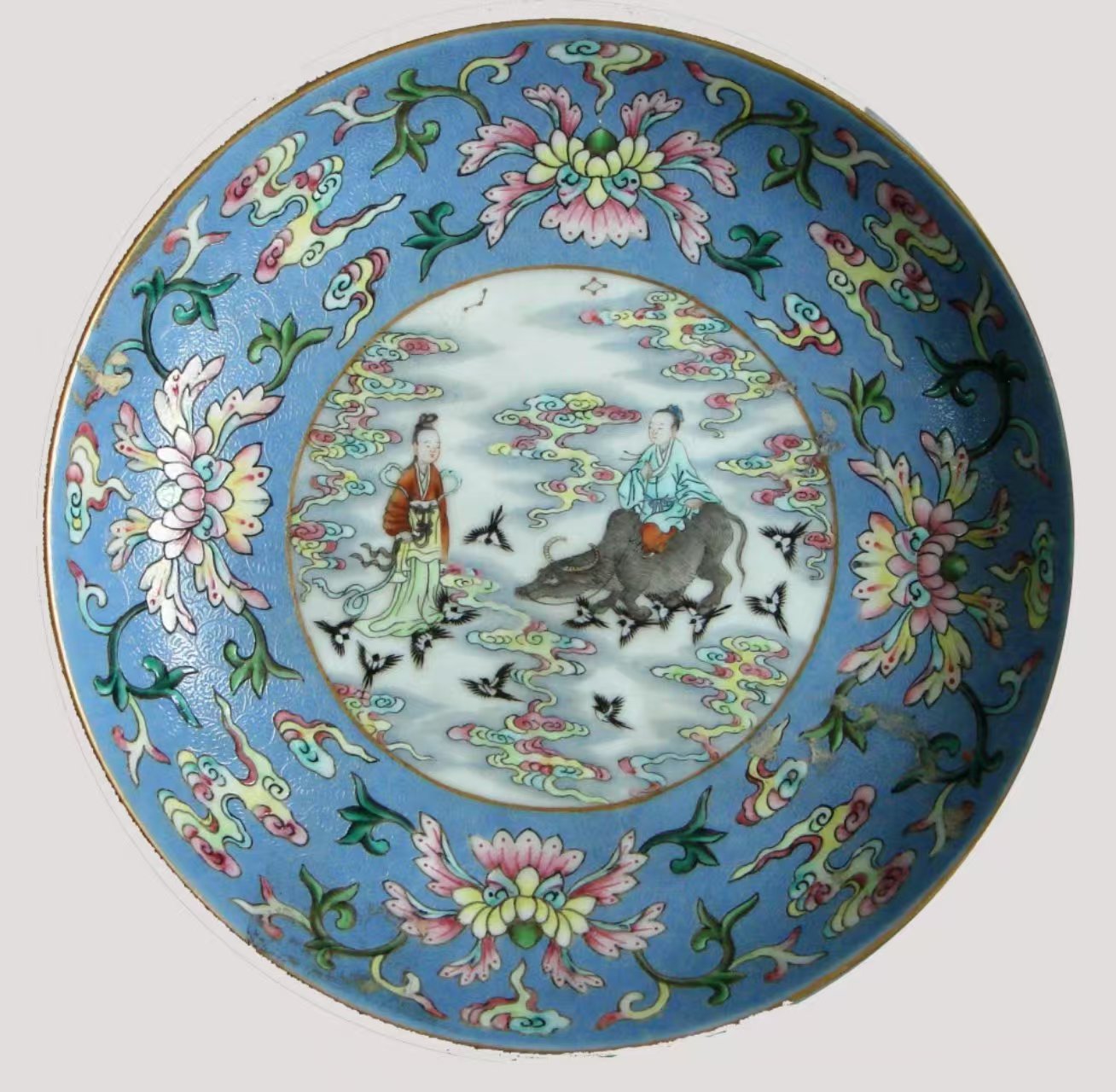 北京藝術(shù)博物館收藏的清代景德鎮(zhèn)官窯粉彩人物圖盤,就像一幅流動(dòng)的七夕畫卷。此盤工藝精湛,口沿涂金,熠熠生輝,盡顯皇家氣派。盤內(nèi)外壁采用“粉彩軋道”工藝,天藍(lán)釉地上淺淺的卷草紋似微風(fēng)輕拂,粉彩花卉與朵云紋相互映襯,如夢(mèng)如幻。盤內(nèi)底描金圓形開光處,粉彩繪就的人物故事圖案更為生動(dòng):牛郎坐于牛背,手握韁繩,深情凝望;織女身姿婀娜,嬌羞回望,二人似在互訴衷腸。背景中祥云繚繞、星辰閃爍、鵲鳥紛飛,為這場(chǎng)相會(huì)營造了浪漫的氛圍。外底“鵲橋仙渡”四字,點(diǎn)明主題。