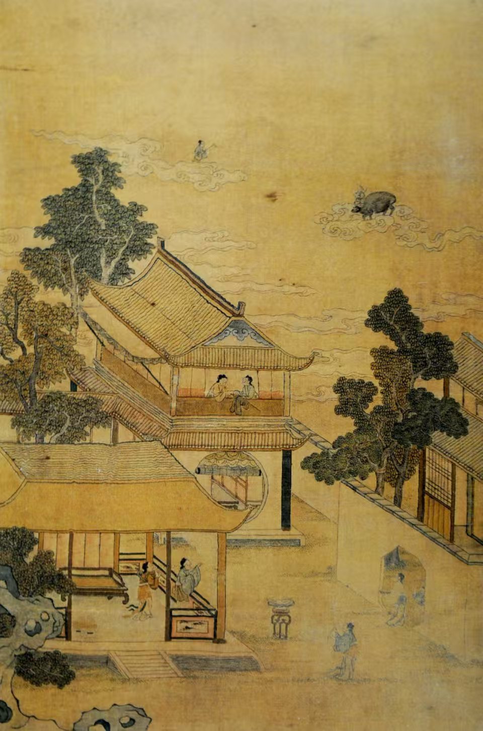 北京故宮博物院收藏的清代緙絲七夕乞巧圖軸,將天上和人間完美融合:上半部分是天上,牛郎織女在祥云圍繞下相會(huì),眼神中充滿了深情和眷戀;下半部分是人間,幾位婦女或憑欄遠(yuǎn)眺,或?qū)掌蚯?,一派和諧景象。這幅圖軸以緙絲工藝展現(xiàn),色彩豐富、線條細(xì)膩,不僅展現(xiàn)了古人高超的技藝,也反映了當(dāng)時(shí)社會(huì)對(duì)七夕節(jié)的重視和人民對(duì)美好生活的向往。