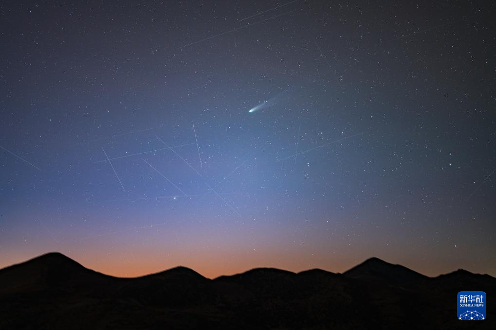 這是10月20日在四川省稻城縣子午工程二期圓環(huán)陣太陽射電成像望遠鏡前拍攝的萊蒙彗星。新華社發(fā)(戴建峰 攝)