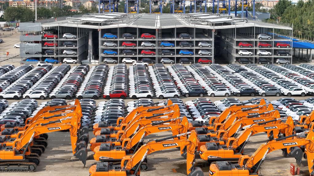 10月20日,國產(chǎn)汽車和工程機械在山東港口煙臺港集結(jié)等待裝船出口(無人機照片)。新華社發(fā)(唐克攝)