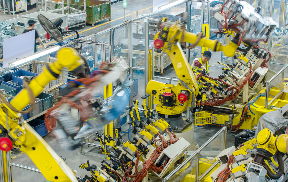 浙江省湖州市長(zhǎng)興經(jīng)濟(jì)技術(shù)開(kāi)發(fā)區(qū)的長(zhǎng)興地通汽車部件有限公司技術(shù)人員操控工業(yè)機(jī)器人生產(chǎn)新能源汽車配件(無(wú)人機(jī)照片,2025年10月9日攝)。新華社發(fā)(譚云俸 攝)