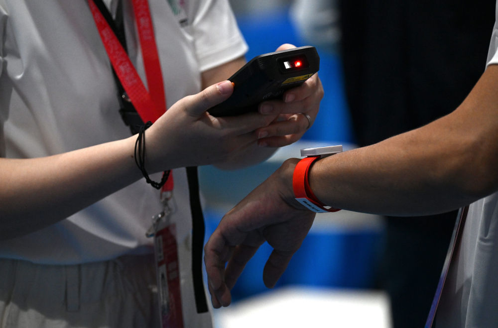 ↑11月8日,在前置安檢區(qū),工作人員在查驗(yàn)各代表隊(duì)跨境手環(huán)。
