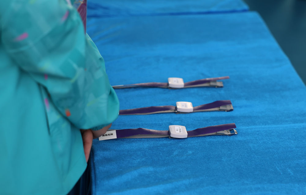 ↑11月8日,志愿者為參賽隊(duì)員佩戴跨境手環(huán)。