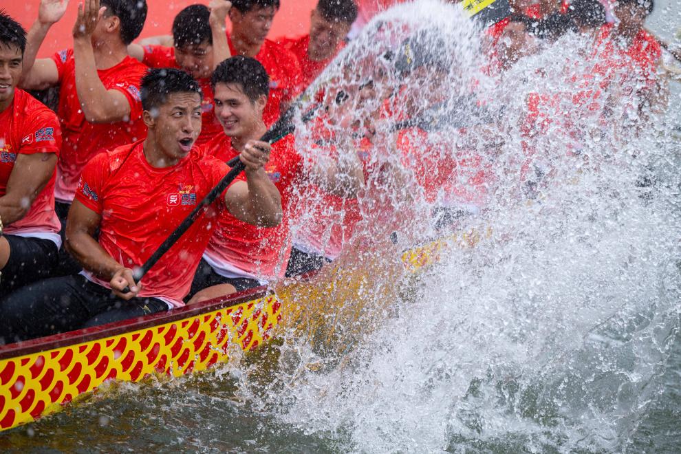 在香港仔海濱公園舉行的龍舟競(jìng)渡大賽中,參賽選手奮楫爭(zhēng)先(2023年6月22日攝)。