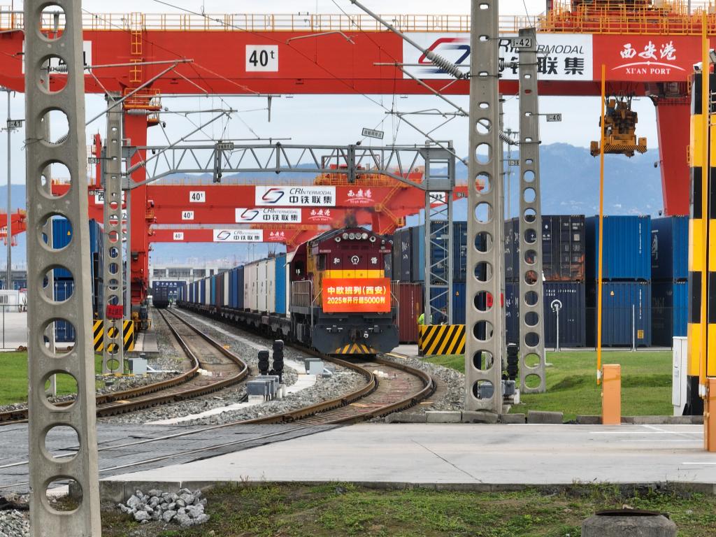 初冬的西安國際港站,機(jī)車轟鳴、吊臂林立。滿載汽車配件、光伏組件和跨境電商貨物的X9043次中歐班列緩緩駛出站臺,奔赴阿塞拜疆巴庫。鐵軌延伸處,“鋼鐵駝隊”川流不息,鋪展出一幅亞歐大陸互聯(lián)互通的生動圖景。