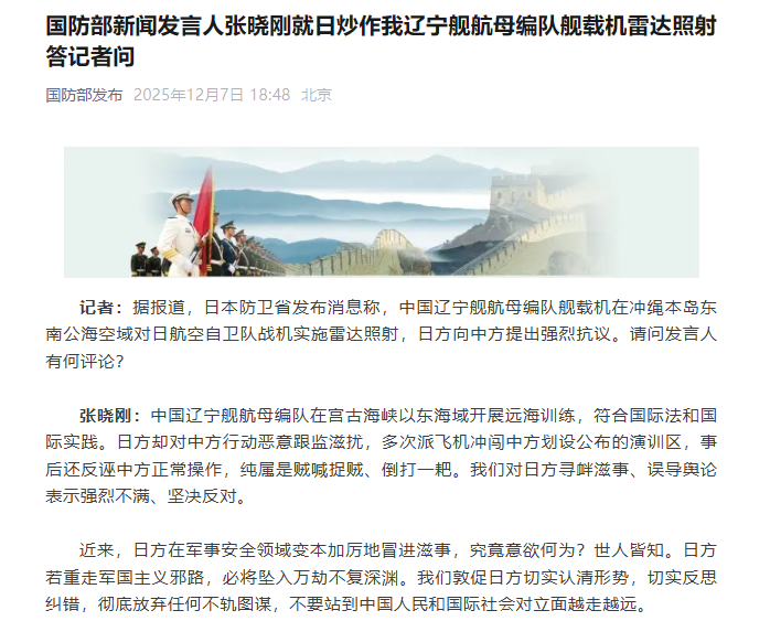 國防部新聞發(fā)言人張曉剛就日炒作我遼寧艦航母編隊艦載機雷達照射答記者問