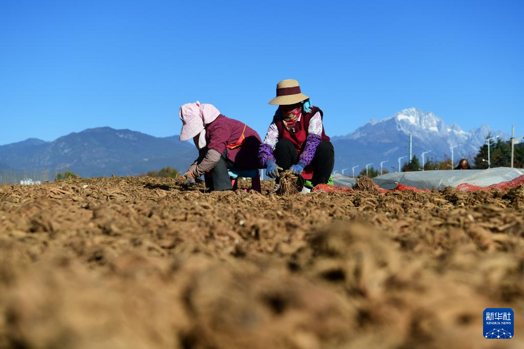 12月7日,農(nóng)民在云南省麗江市玉龍縣黃山街道的一處空地分揀、晾曬中藥材當(dāng)歸。新華社發(fā)(趙慶祖 攝)