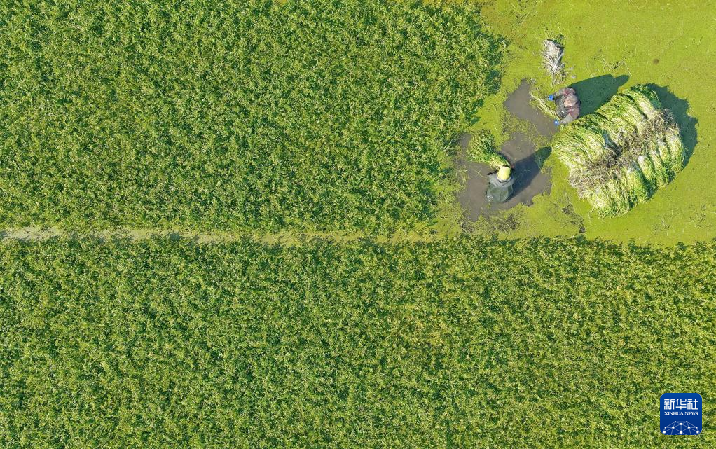 12月7日,江蘇省海安市墩頭鎮(zhèn)長垎村水芹菜種植基地,菜農(nóng)在水田里采收水芹菜(無人機照片)。新華社發(fā)(周強 攝)