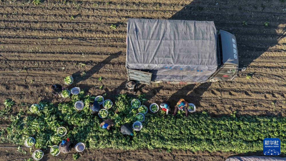 12月7日,河北省唐山市玉田縣虹橋鎮(zhèn)農(nóng)民在田間將冬儲大白菜裝車外運(無人機照片)。新華社發(fā)(劉滿倉 攝)