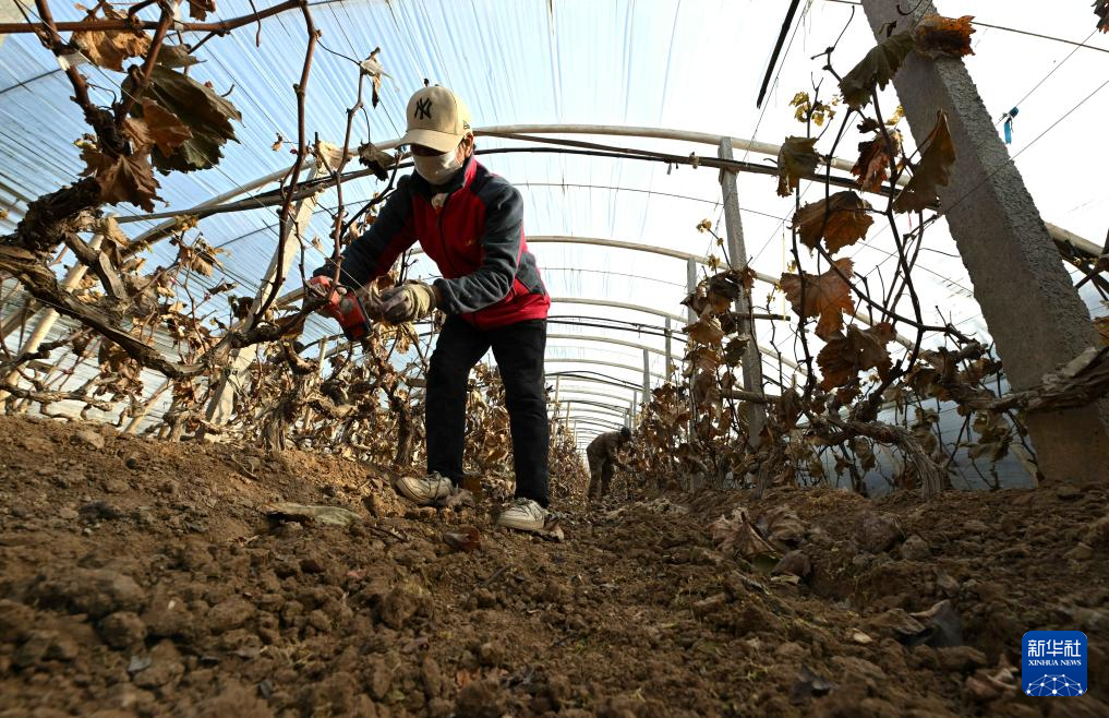 12月7日,農(nóng)民在河北省石家莊市新華區(qū)陳村葡萄采摘園里剪枝管護(hù)。新華社發(fā)(陳其保 攝)