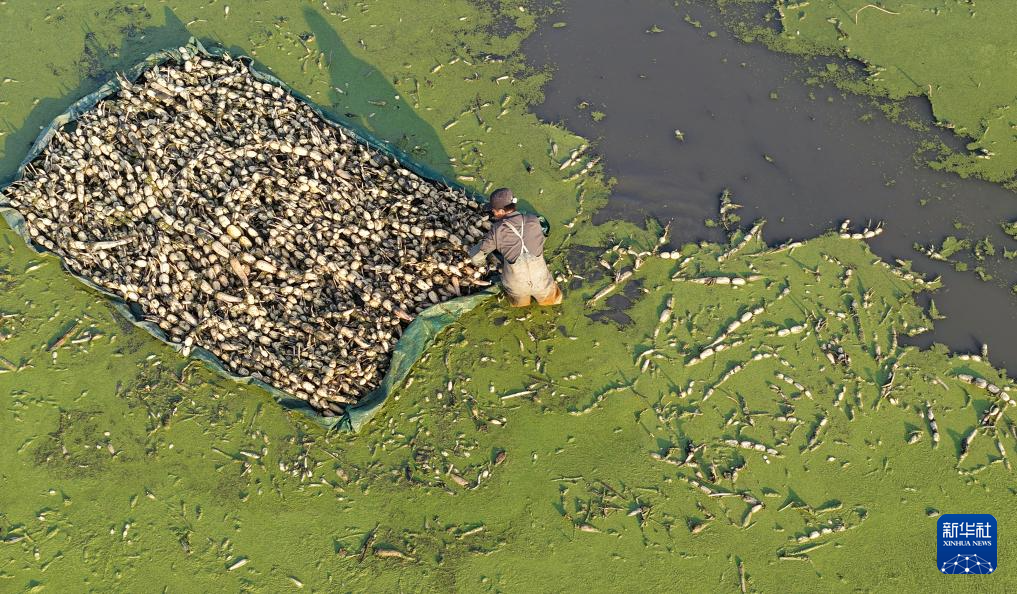 12月7日,江蘇省海安市墩頭鎮(zhèn)一處淺水藕種植基地,藕農(nóng)忙著采收淺水藕(無人機照片)。新華社發(fā)(周強攝)