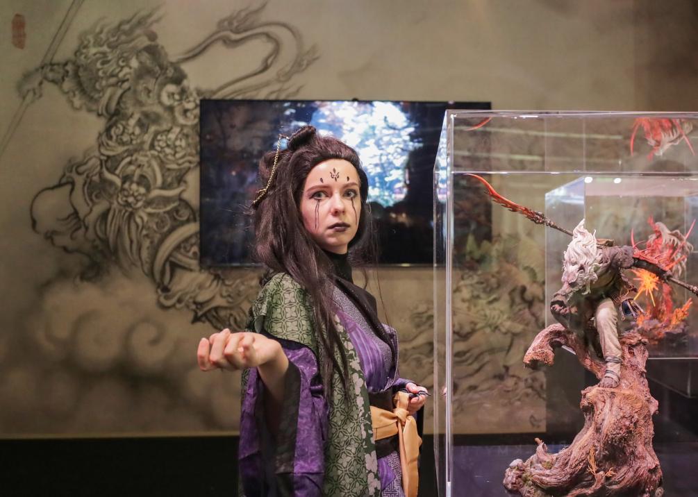 2025年8月20日,在德國(guó)科隆,一名《黑神話:悟空》游戲角色扮演者在游戲科學(xué)展臺(tái)與模型合影。