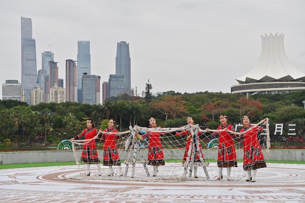 2025年3月31日,黑龍江村歌隊(duì)隊(duì)員在“廣西三月三·八桂嘉年華”開(kāi)幕式暨“四季村歌”活動(dòng)啟動(dòng)儀式現(xiàn)場(chǎng)演唱《烏蘇里船歌》。