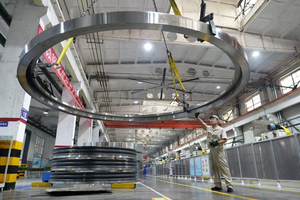 2025年5月22日,工人在洛陽軸承集團股份有限公司風(fēng)電三車間生產(chǎn)線上作業(yè)。新華社記者 李嘉南 攝