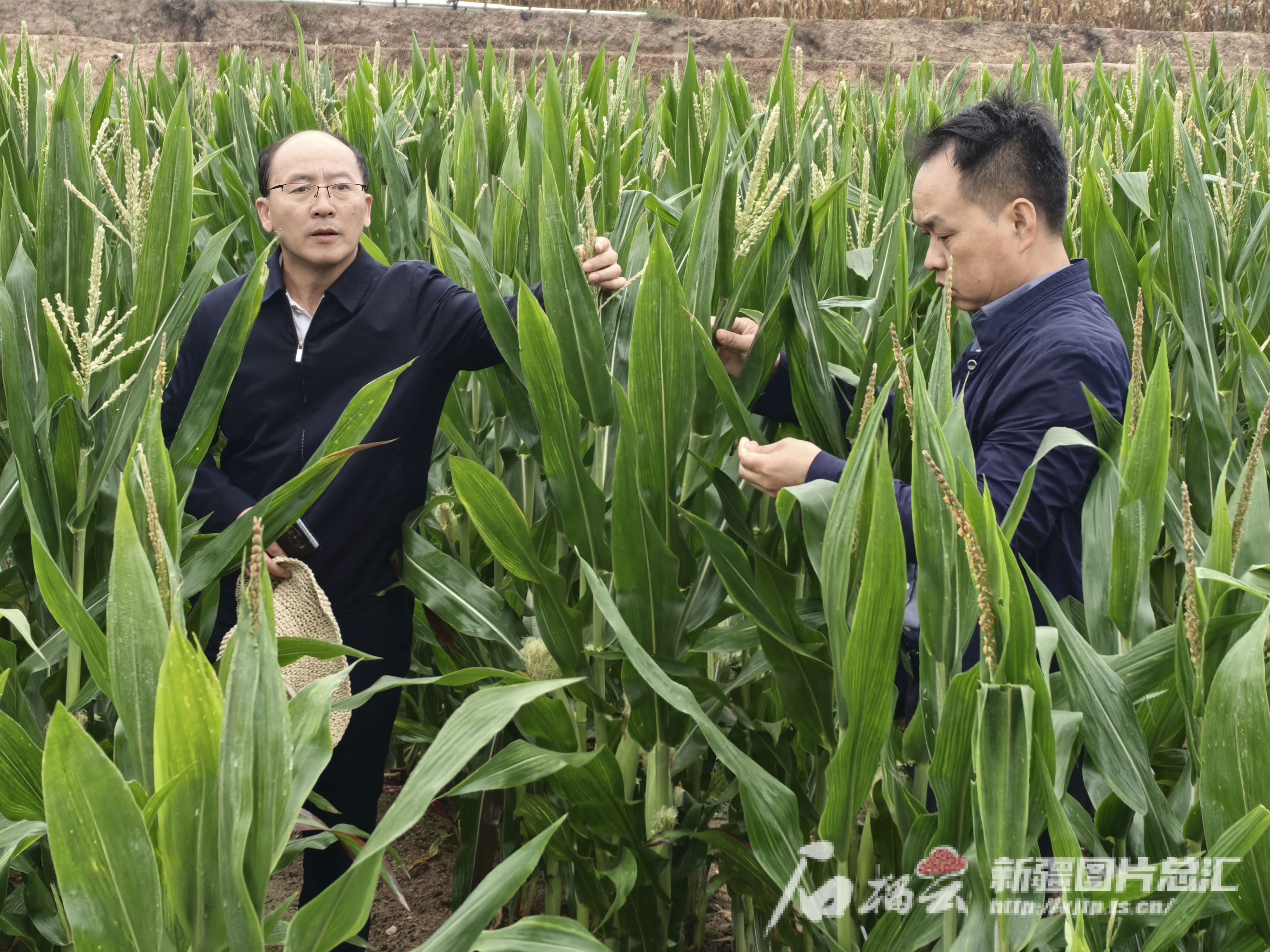 3月19日,在位于海南省三亞市的國家南繁育種基地,新疆天玉種業(yè)有限責(zé)任公司董事長兼總經(jīng)理吳洪濤(左)和同事在察看公司試驗田里制種玉米的生長情況。受訪本人供圖