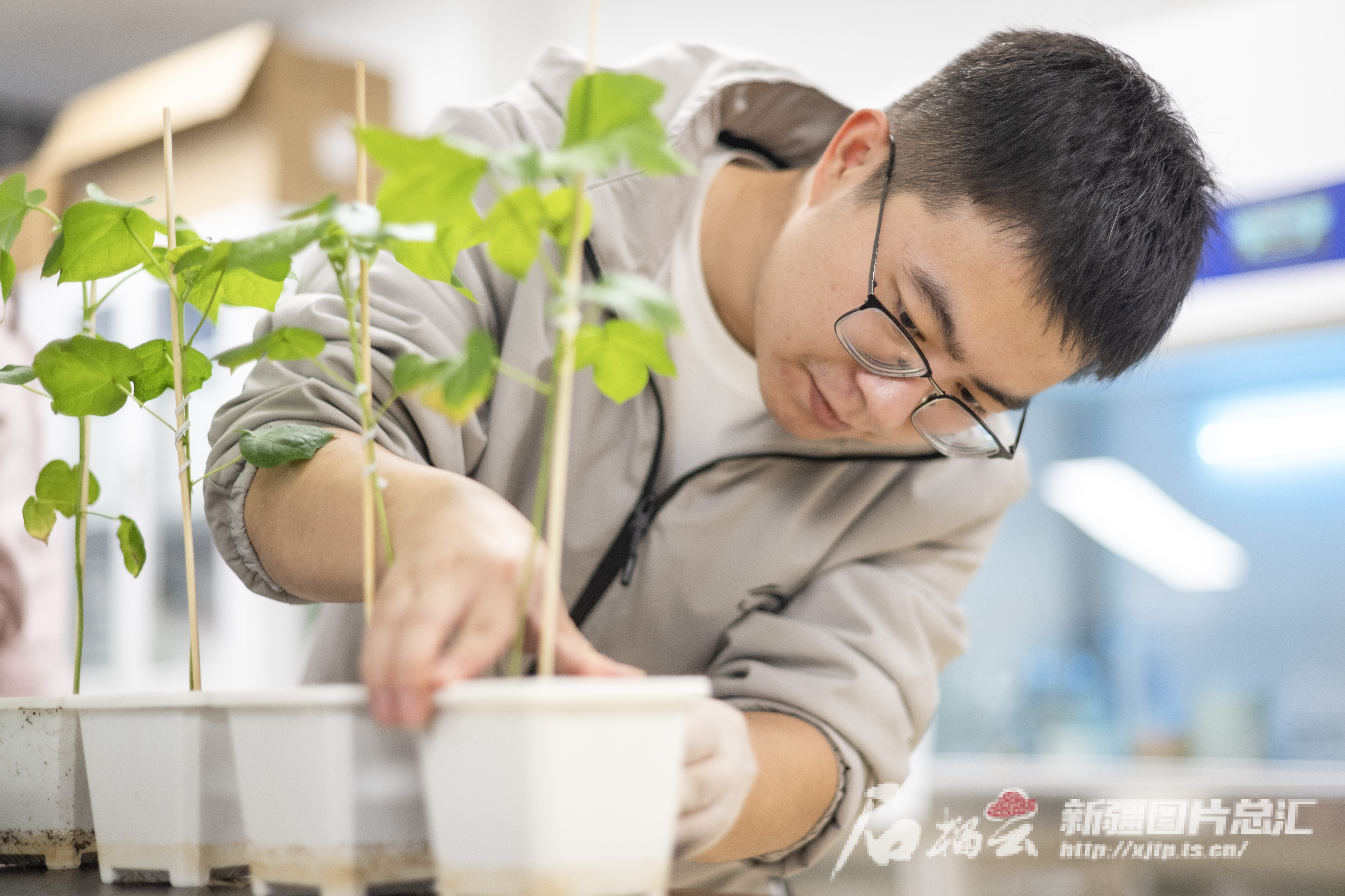 3月27日,在昌吉國家農(nóng)業(yè)高新技術(shù)產(chǎn)業(yè)示范區(qū)中國農(nóng)業(yè)科學(xué)院西部農(nóng)業(yè)研究中心,研究員在觀察基因編輯棉花品種植株的長勢。何龍攝