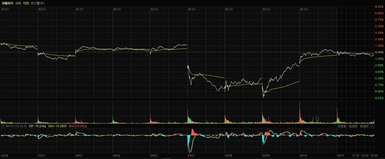 4月11日收盤時,新疆板塊指數(shù)跌0.65%,報收16784.33點,21只股票上漲,40只股票下跌,上漲率34.43%,總換手率2.05%,總成交額156.98億元。