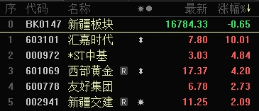 4月11日新疆板塊股價漲幅排名(來自東方財富)。