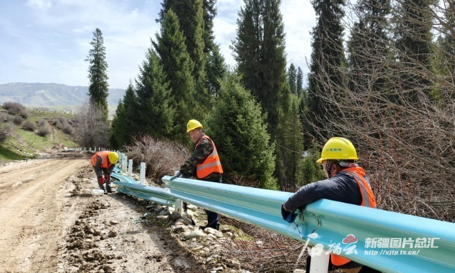 4月以來,S345線庫爾德寧—恰西—塔里木—喀拉峻公路工程項目全面啟動施工,圖為工人們正在進行護欄拆除工作。伊犁融媒體中心供圖
