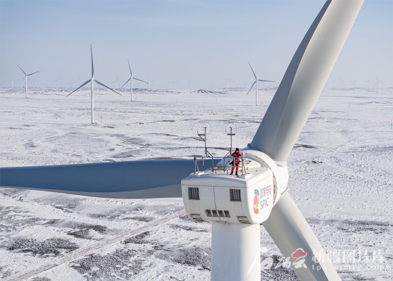 技術(shù)人員在木壘老君廟風(fēng)電場檢修風(fēng)機(jī)(資料圖片)。何龍 攝