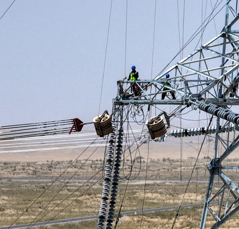 在和田—民豐—且末—若羌750千伏輸變電工程現(xiàn)場(chǎng),電力員工進(jìn)行走線驗(yàn)收(6月24日攝,無人機(jī)照片)。新華社發(fā)(馬元攝)