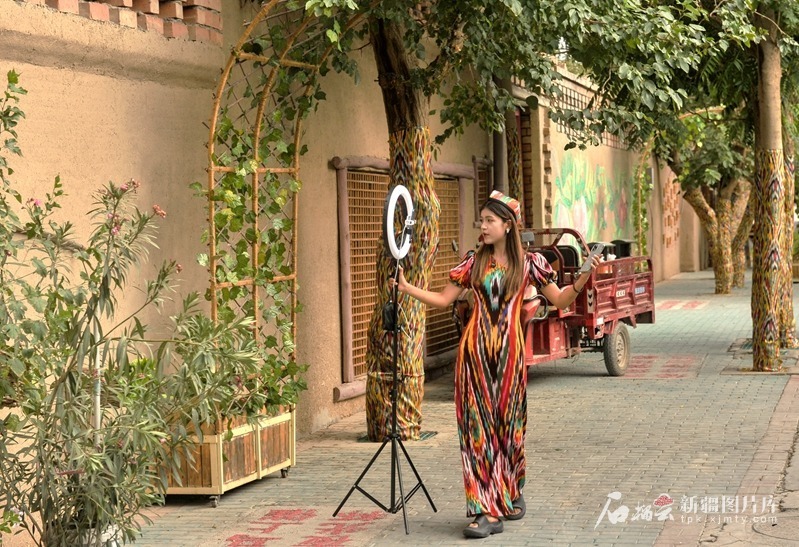 7月8日,新城西門村村民通過網(wǎng)絡(luò)直播介紹家鄉(xiāng)。 天山網(wǎng)-新疆日?qǐng)?bào)記者王禹攝