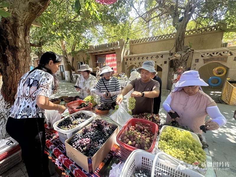 7月9日,吐魯番市葡萄溝景區(qū),游客在購(gòu)買鮮食葡萄。 阿地蘭攝
