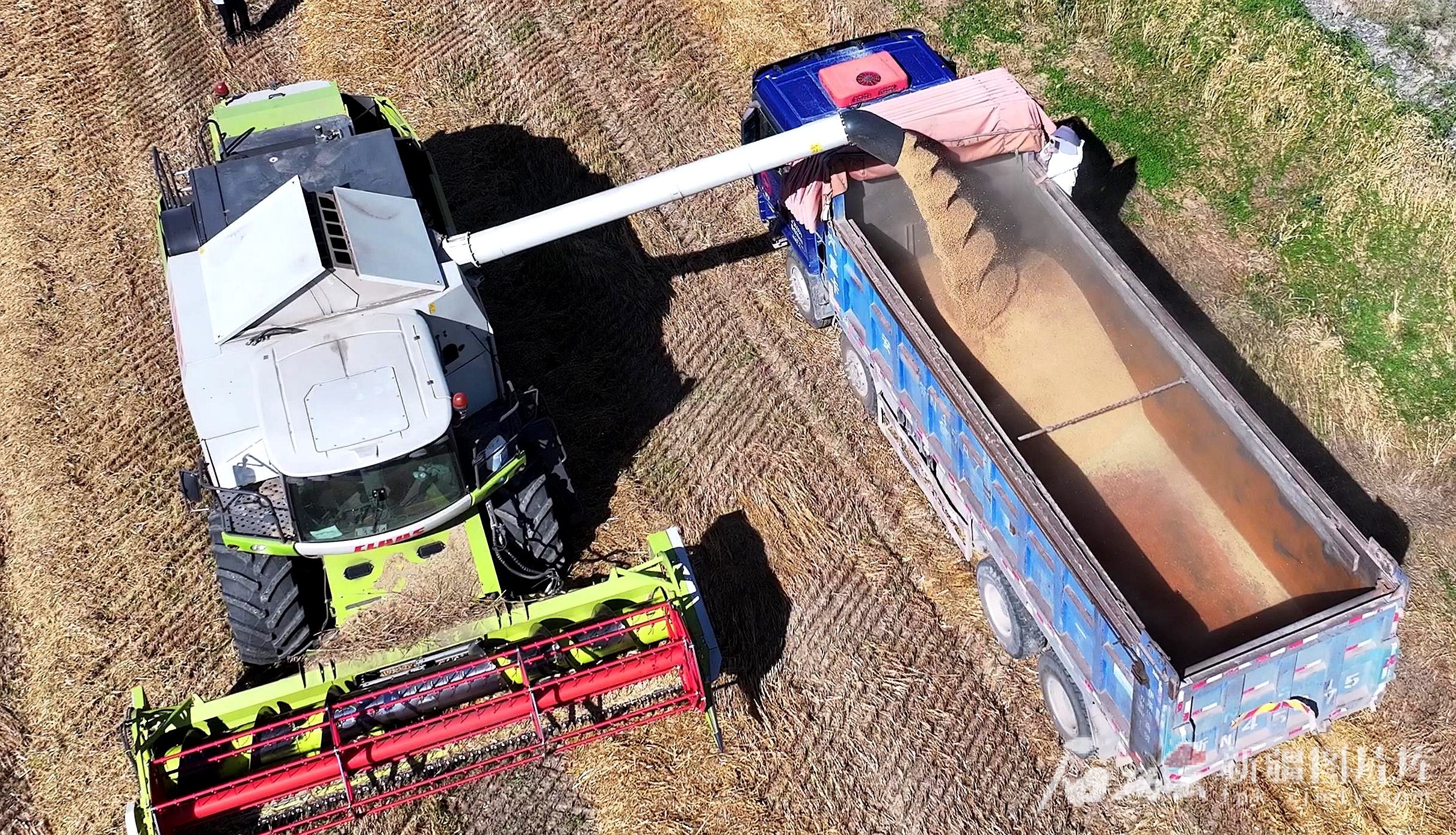 7月15日,在沙灣市東灣鎮(zhèn)的小麥地里,大型收割機(jī)在麥田里來回穿梭,將采收下來的麥粒裝上卡車運(yùn)往糧站。宋建亮攝