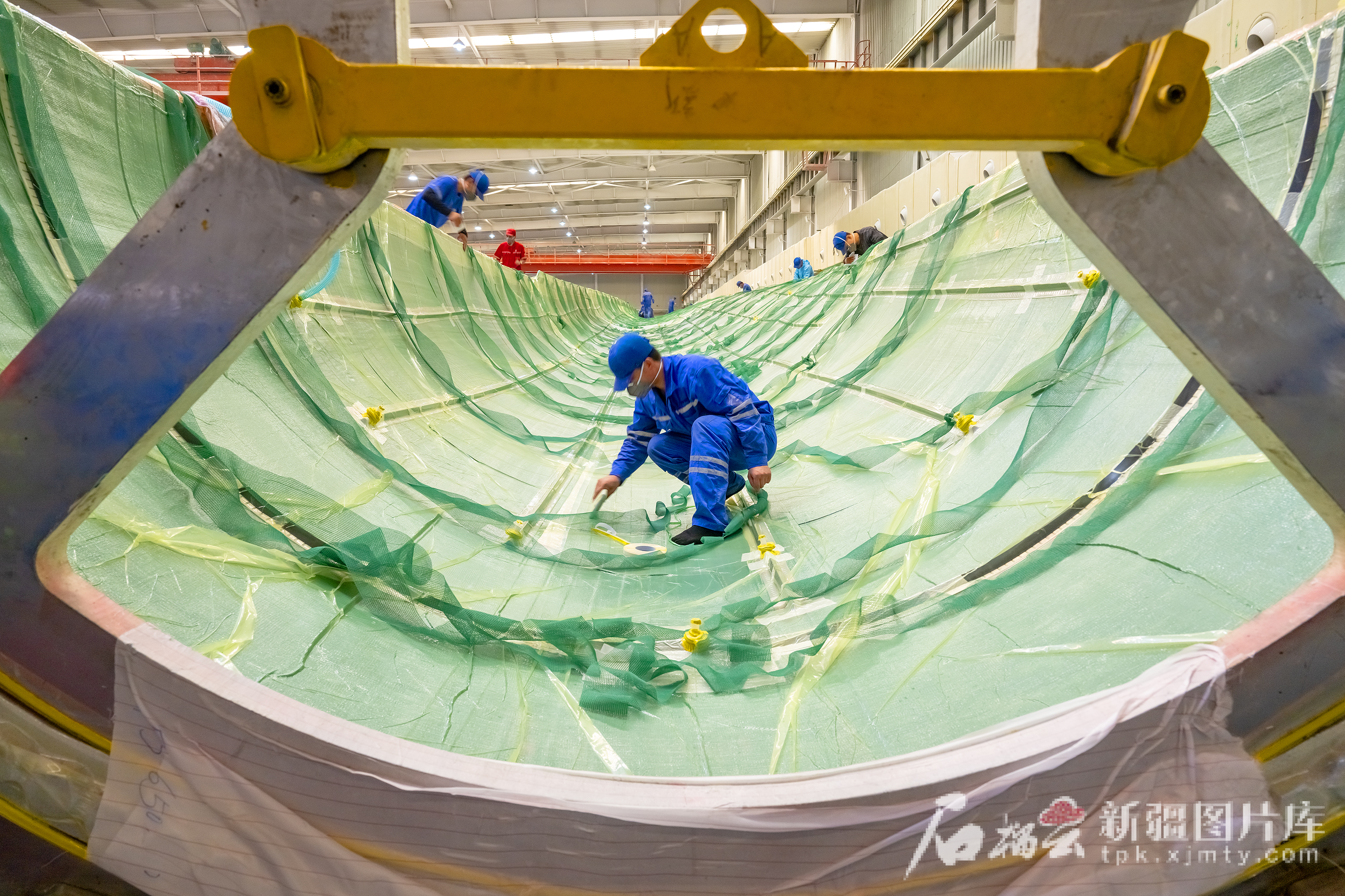 6月13日,哈密市伊州區(qū)一家風電機組葉片生產(chǎn)企業(yè)的生產(chǎn)車間。哈密市伊州區(qū)是西北地區(qū)規(guī)模最大、產(chǎn)業(yè)鏈最全的風電裝備制造基地。金煒攝
