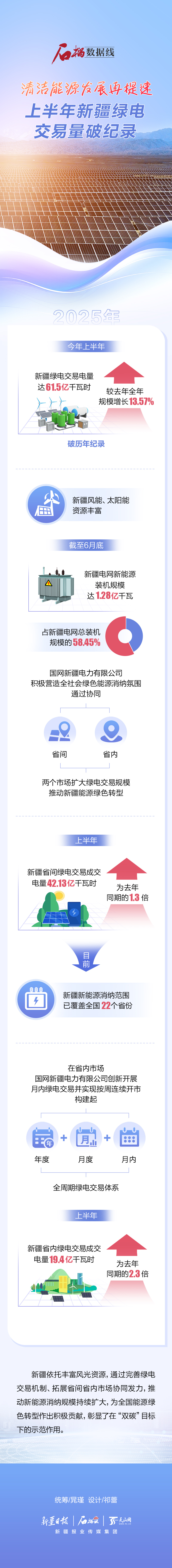 今年上半年,新疆綠電交易電量達(dá)61.5億千瓦時,較去年全年規(guī)模增長13.57%,破歷年紀(jì)錄。