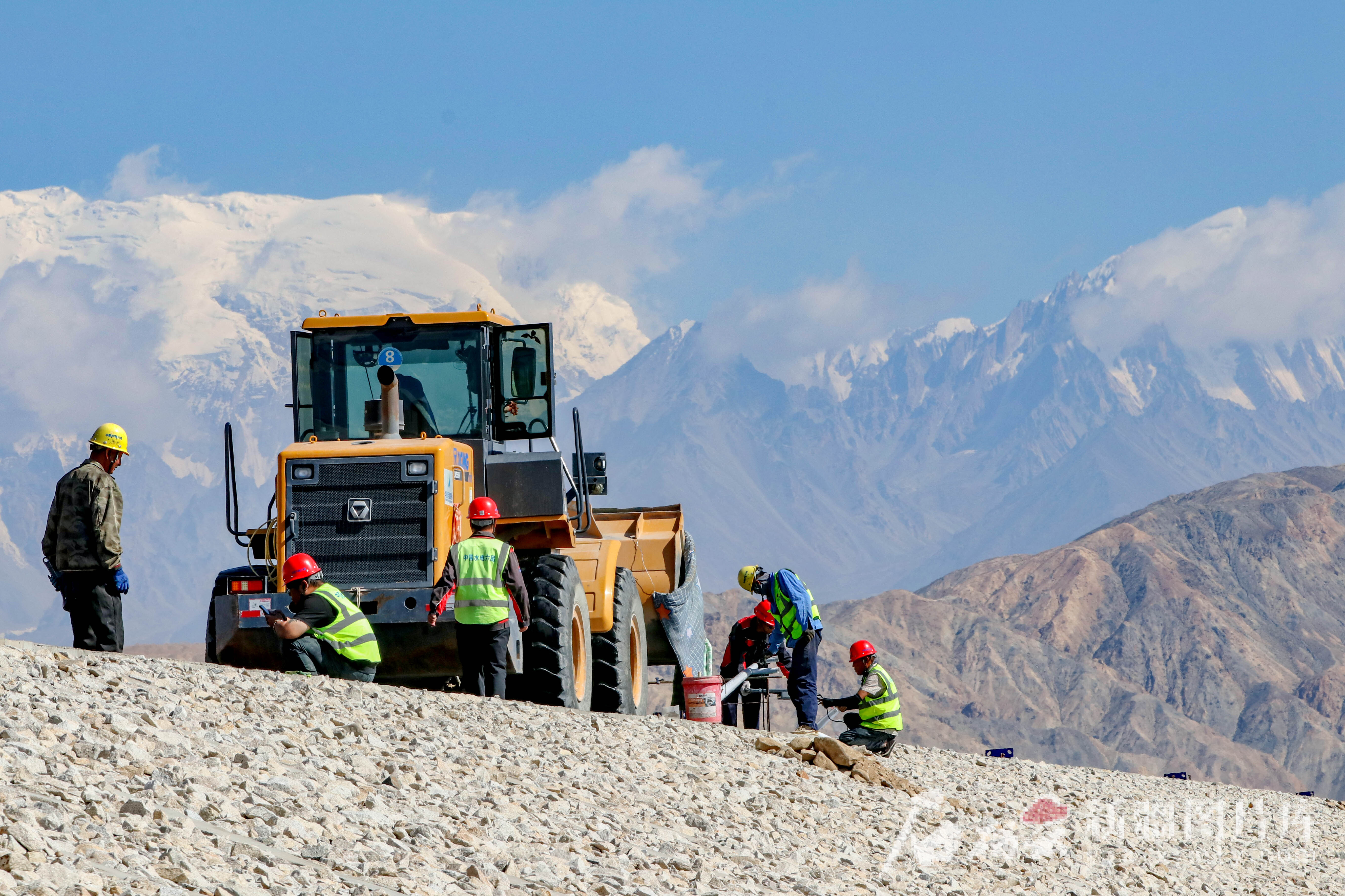 8月6日,工人在塔什庫爾干塔吉克自治縣阿然保泰水庫壩體上進行附屬設施施工。
