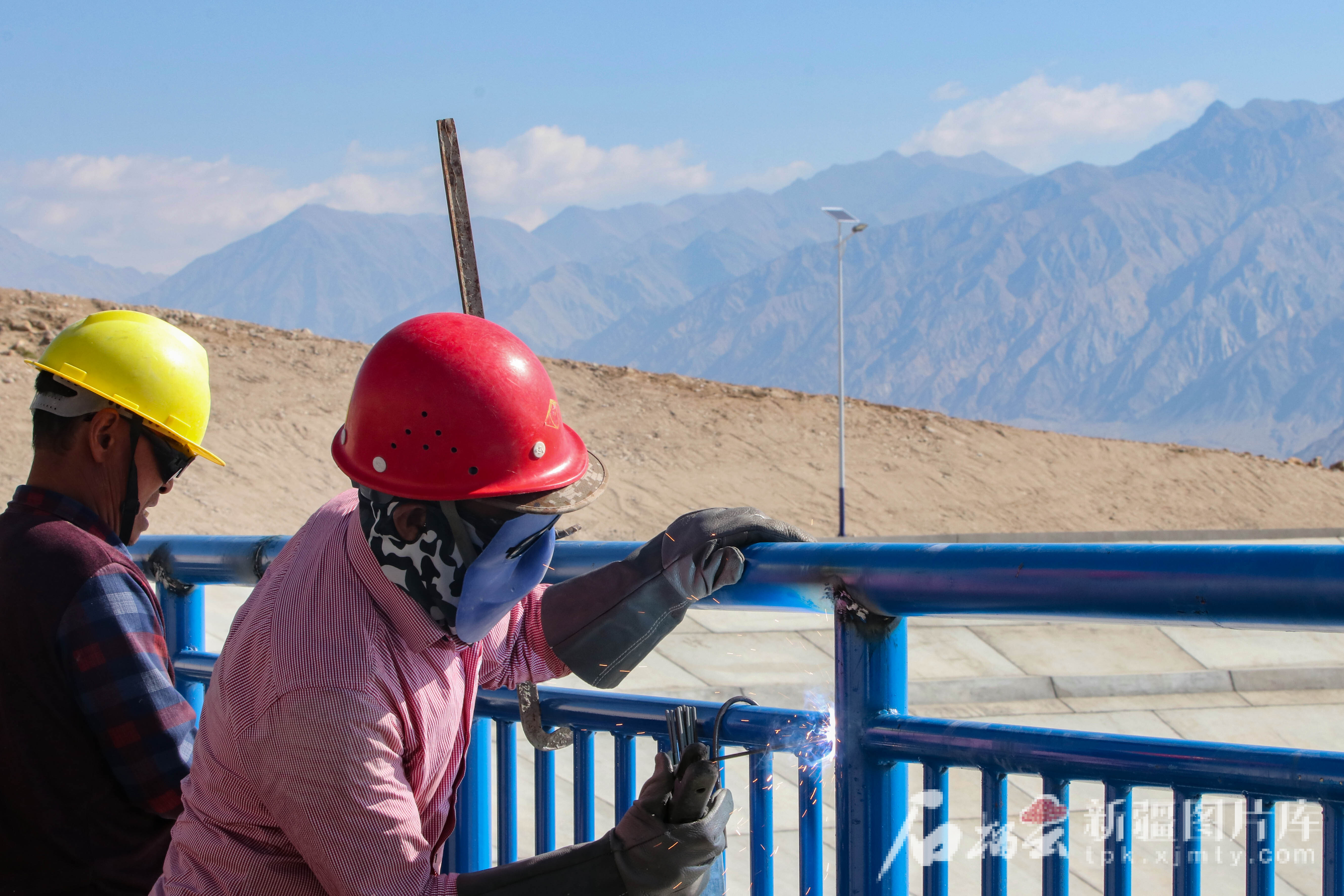 8月6日,工人在塔什庫爾干塔吉克自治縣阿然保泰水庫壩體上安裝護欄。