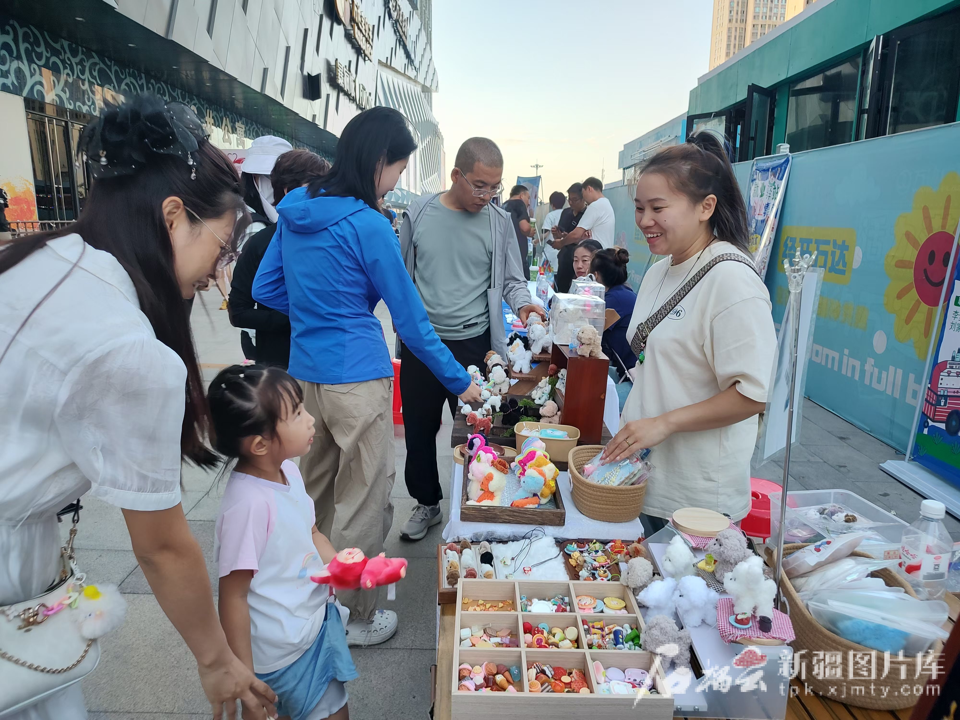 8月16日晚,由烏魯木齊經(jīng)濟技術開發(fā)區(qū)(頭屯河區(qū))人力資源和社會保障局聯(lián)合烏魯木齊市公共就業(yè)服務中心打造的“星芒創(chuàng)集·經(jīng)開夜巷”創(chuàng)業(yè)集市現(xiàn)場,一位攤主與小顧客交流。天山網(wǎng)-新疆日報記者 李琳攝