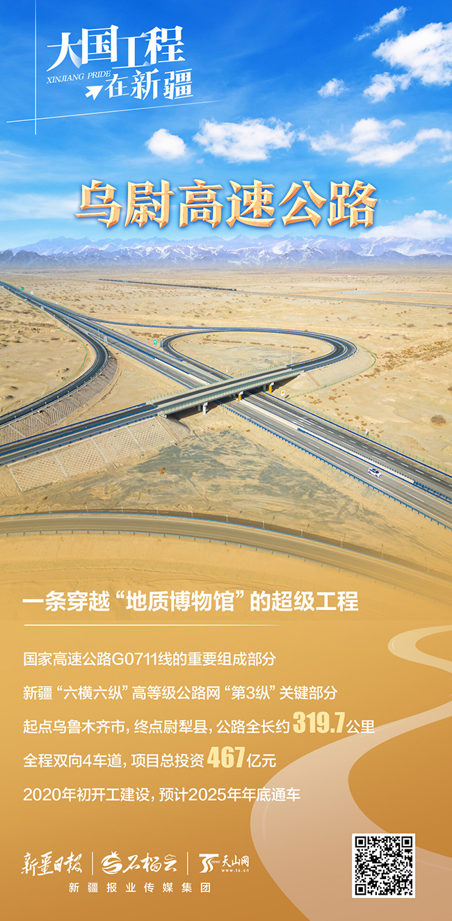 烏尉高速公路(G0711),起點烏魯木齊市,終點尉犁縣,公路全長約319.7公里,全程雙向4車道。項目總投資467億元,于2020年初開工建設(shè)。