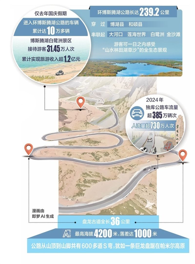 以獨(dú)庫公路為例,2024年,獨(dú)庫公路車流量超385萬輛次、人流量超730萬人次。當(dāng)自駕游客踩下油門,車輪卷起的不僅是天山的沙石,更是沿線經(jīng)濟(jì)的蓬勃生機(jī)。