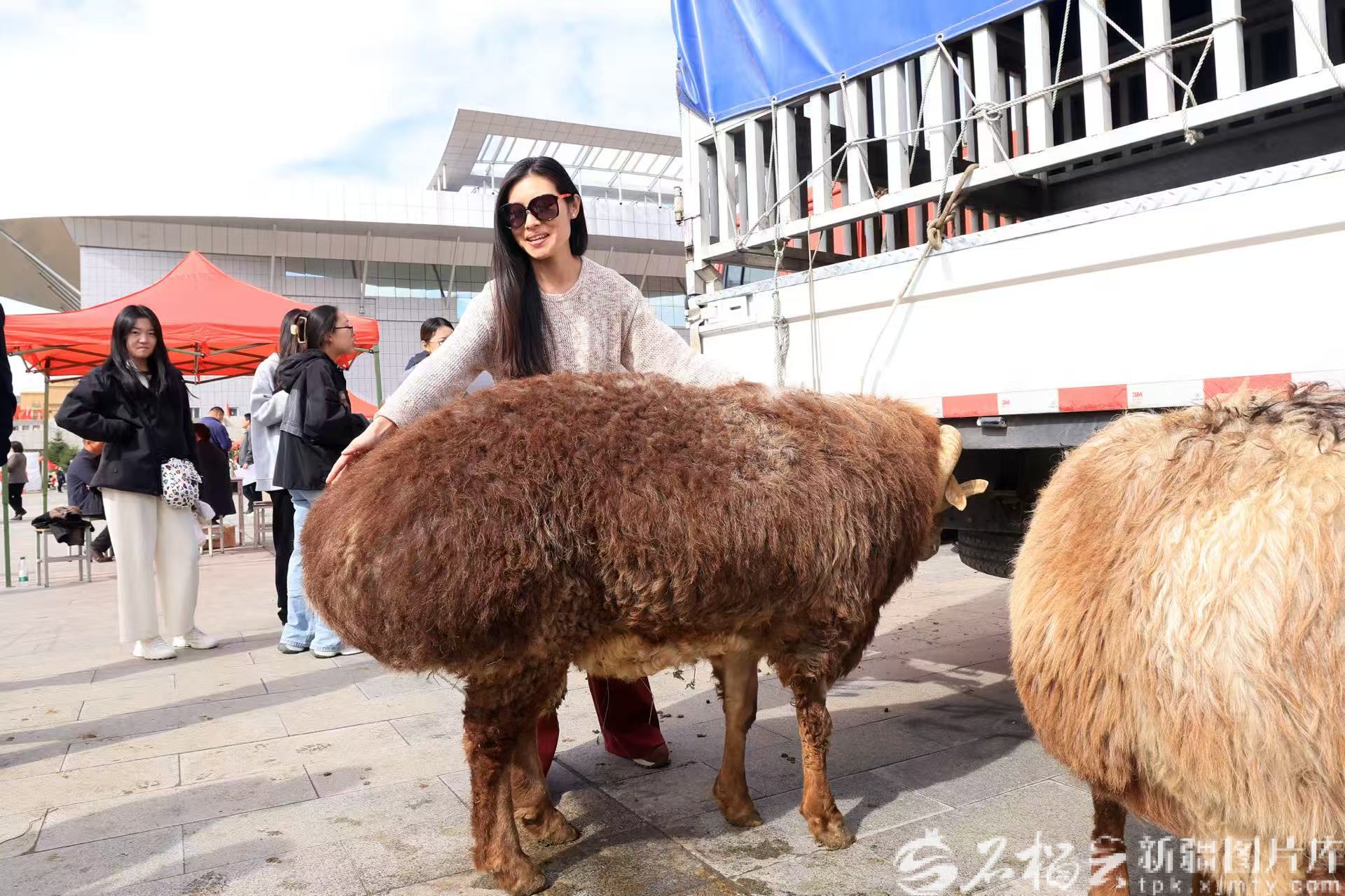 在2025年“中國(guó)農(nóng)民豐收節(jié)”阿勒泰市專場(chǎng)活動(dòng)特色農(nóng)畜產(chǎn)品之最評(píng)選環(huán)節(jié)中,一位游客與參評(píng)的阿勒泰羊合影。阿爾達(dá)克·拜斯汗 攝
